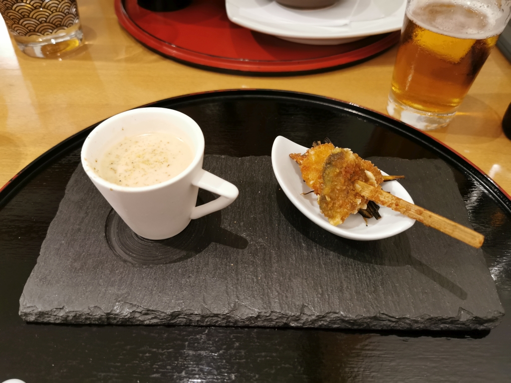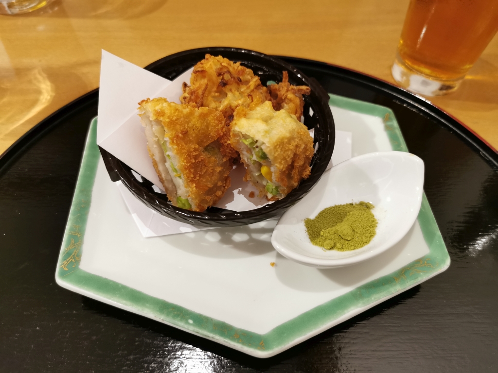 Danach ein Klassiker aus der Izakaya-Küche: Frittiertes Gemüse mit einem Fisch-Cake.