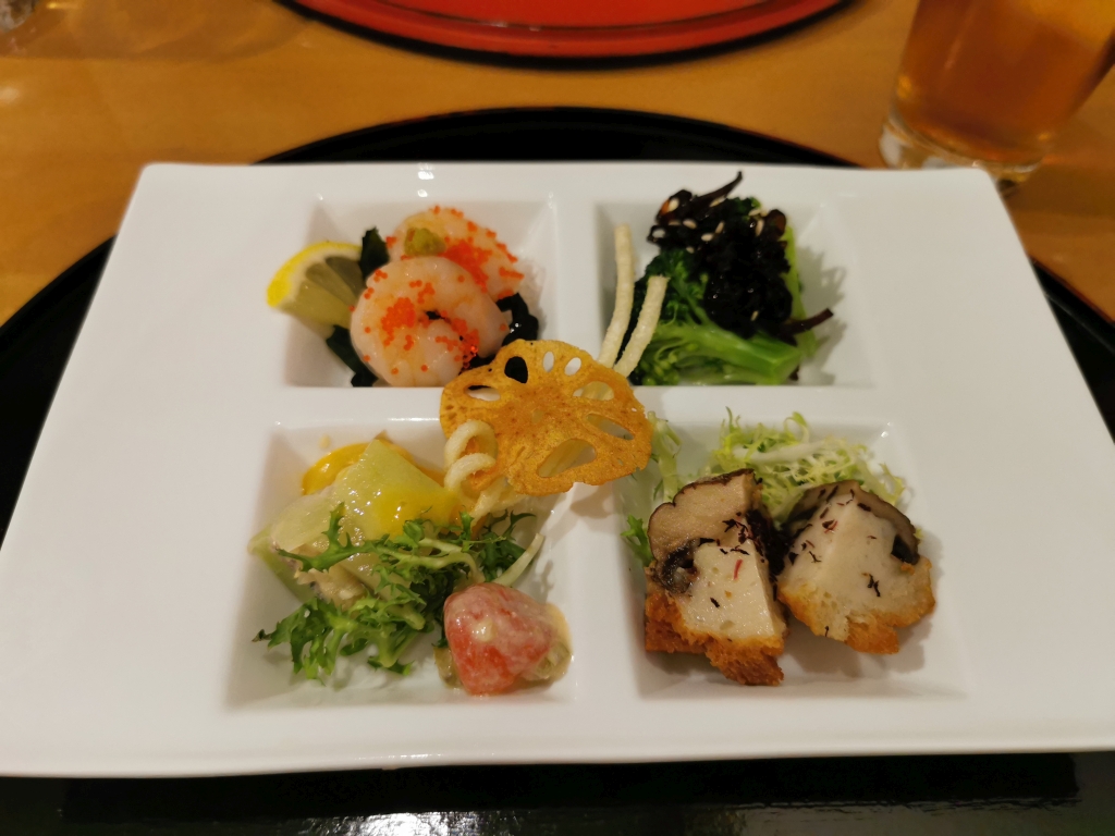 Zweiter Gang: Vorspeisen der Saison. Dabei gab es eine Tempura-Lotusblüte in der Mitte. Dann scharfe Garnelen mit Kombu (oben links), ein Algensalat mit Brokkoli (oben rechts), ein Pilz-Fisch-Cake (unten rechts) und ein Stück Mango, Melone und Sashimi mit süßem Dressing (unten links).