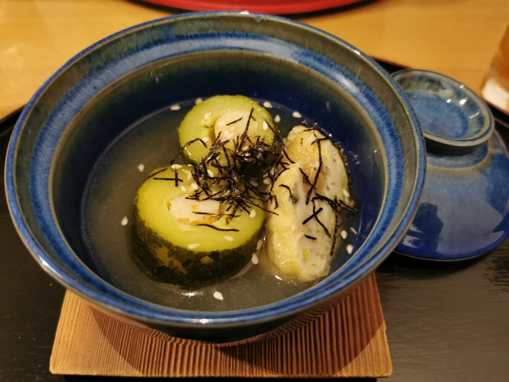 Dann etwas kunstvoller: Mit einer Garnelen-Farce gefüllte Zucchini und gebackener Tofu mit einer Muschel.