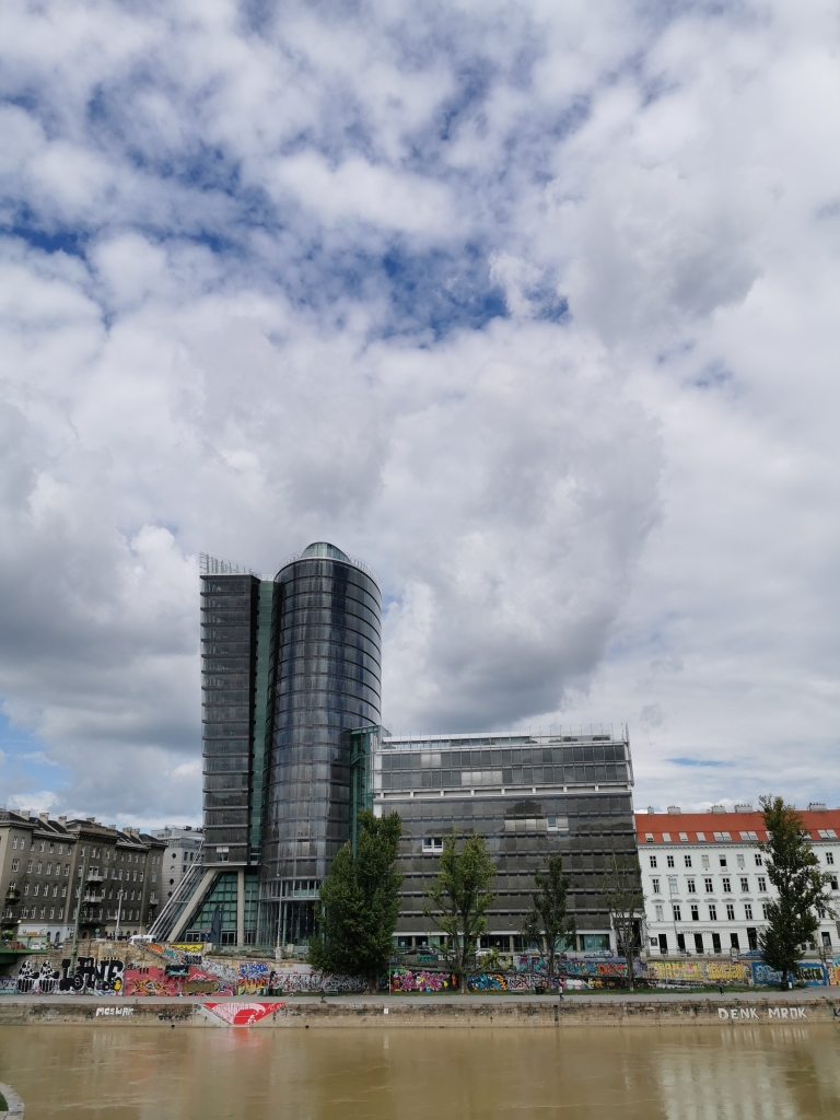 Wir machten uns davon, da uns das doch höchst unangenehm war – mit der Tram ging es zum Donaukanal, wo sowohl moderne Gebäude (hier die Uniqa Versicherung) …