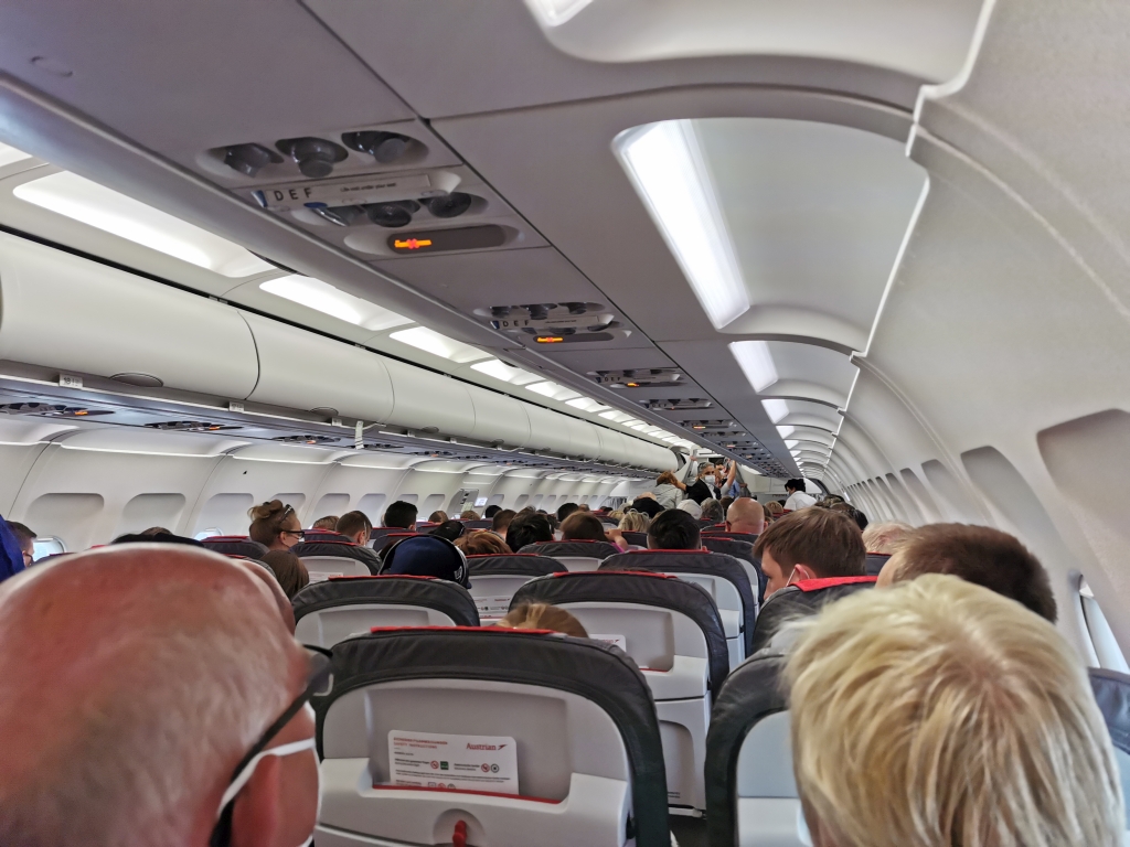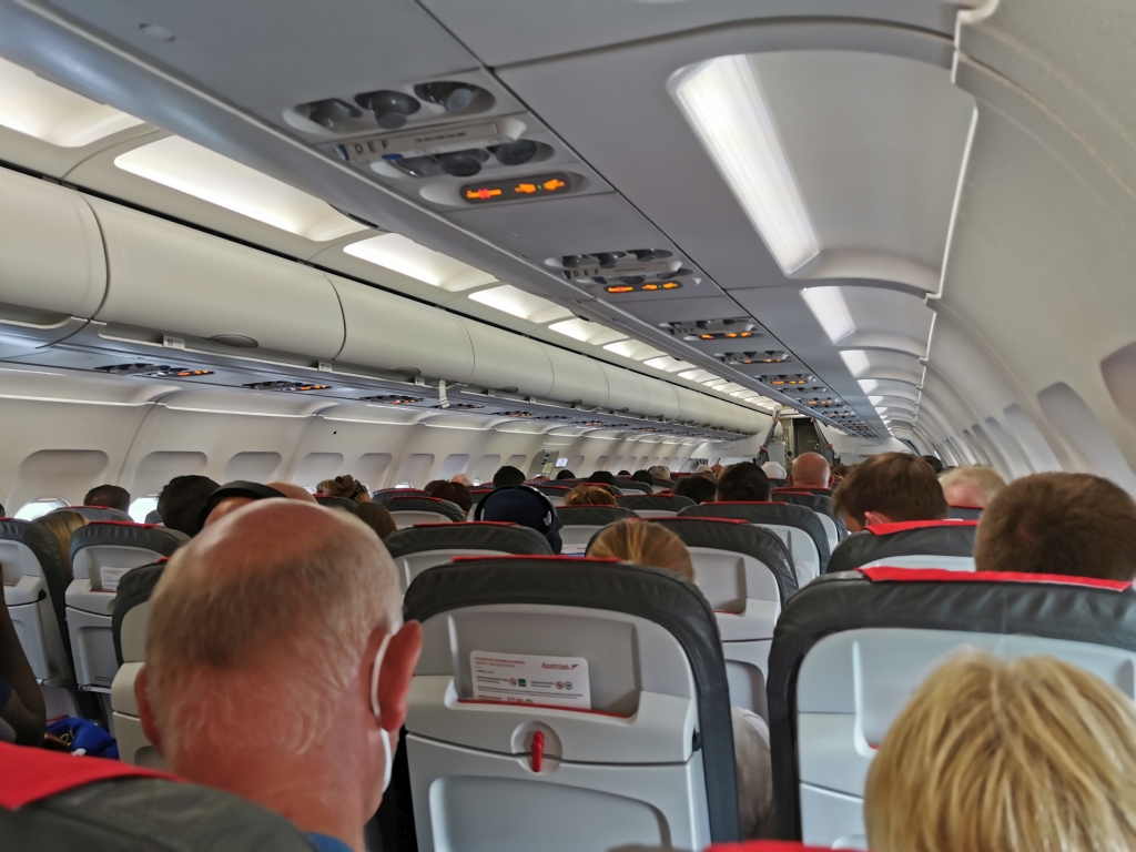 Auch hier: Ein fast voller Flug. Und auch hier: Alle trugen eine Maske, es sei denn, man trank aus dem Glas Wasser, was es als einzige Verpflegung gab. NIcht, dass man bei knapp über eine Stunde Flug eigentlich mehr brauchen würde.