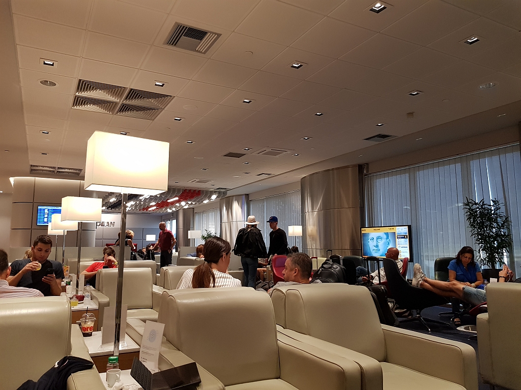 War auch überraschend voll, wobei die intra-europäischen Flüge alle am Vormittag losfliegen – deswegen war auch wenig frei und es herrschte etwas Gewusel in der Lounge. Die trotzdem sehr angenehm ist, auch wenn einige amerikanische Touristen sehr … laut waren und trotz der frühen Uhrzeit schon den einen oder anderen Ouzo becherten.
