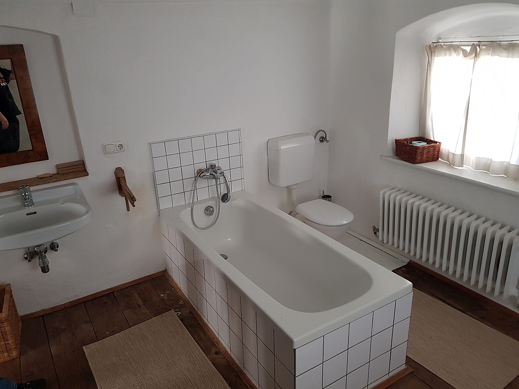 Die Übernachtung im Gästehaus war in der Tat ein Erlebnis. Schlicht aber unglaublich viel Charme – dezent hergerichtet aber mit allem, was man bei einem viele hundert Jahre alten Haus erwartet. Inklusive knarzenden Dielen, niedrigen Türrahmen („Boink!“) und einer … überraschenden Gestaltung des Bades.