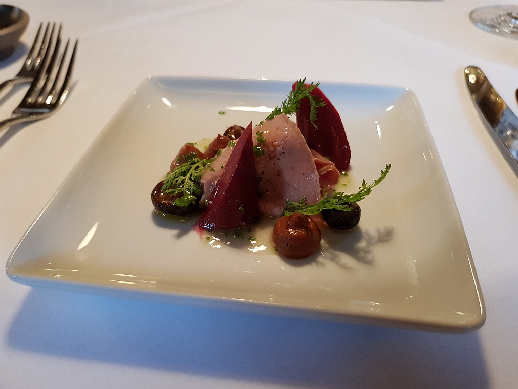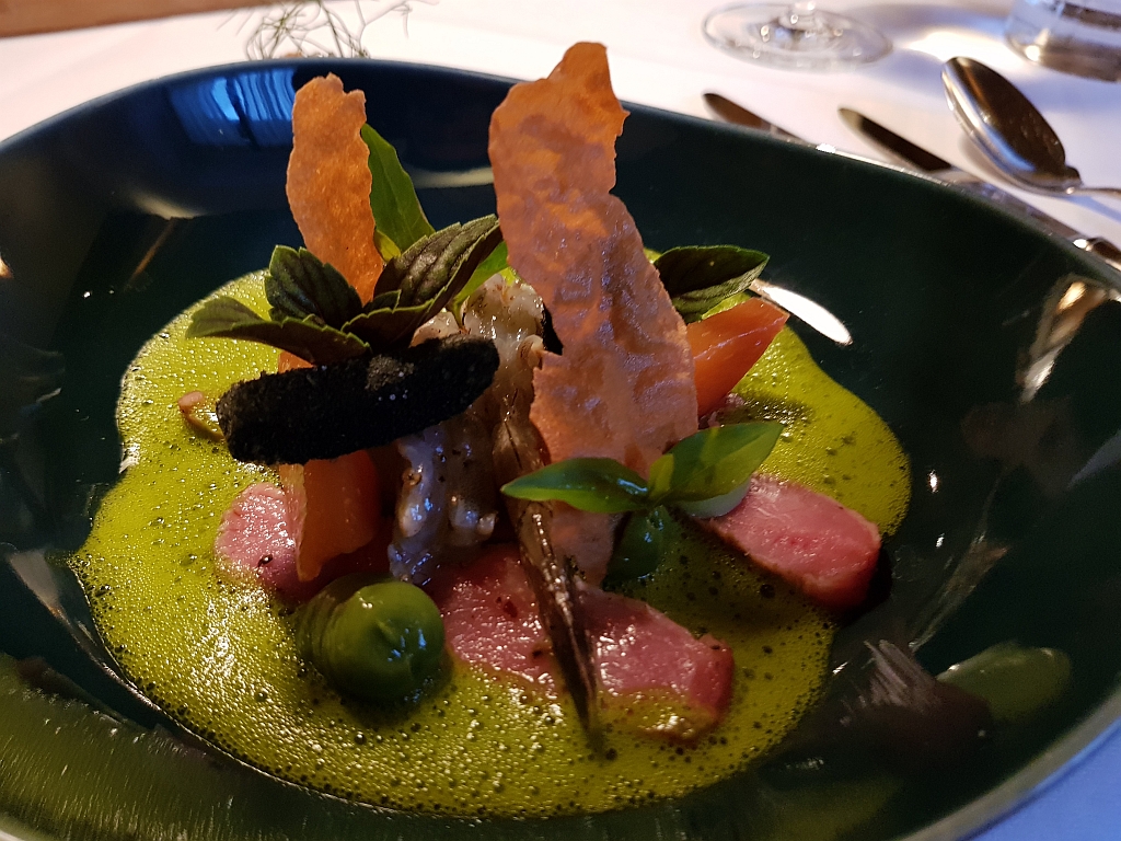 Der nächste Gang, „erster Genussmoment“ genannt: Roastbeef vom Kalb und Engelsgarnele. Dazu Nektarine, Avocado und ein Liebstöckelfond. Letzterer war etwas gewöhnungsbedürftig für uns, aber auch hier: Zusammen mit dem sagenhaften Roastbeef wirklich gut!