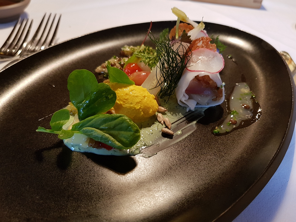 Gang 1 des Menus: Huchen im Lardo, dazu Linsen, Radieschen, Kräuter und (noch nie gesehen) Sonnenblumeneis.