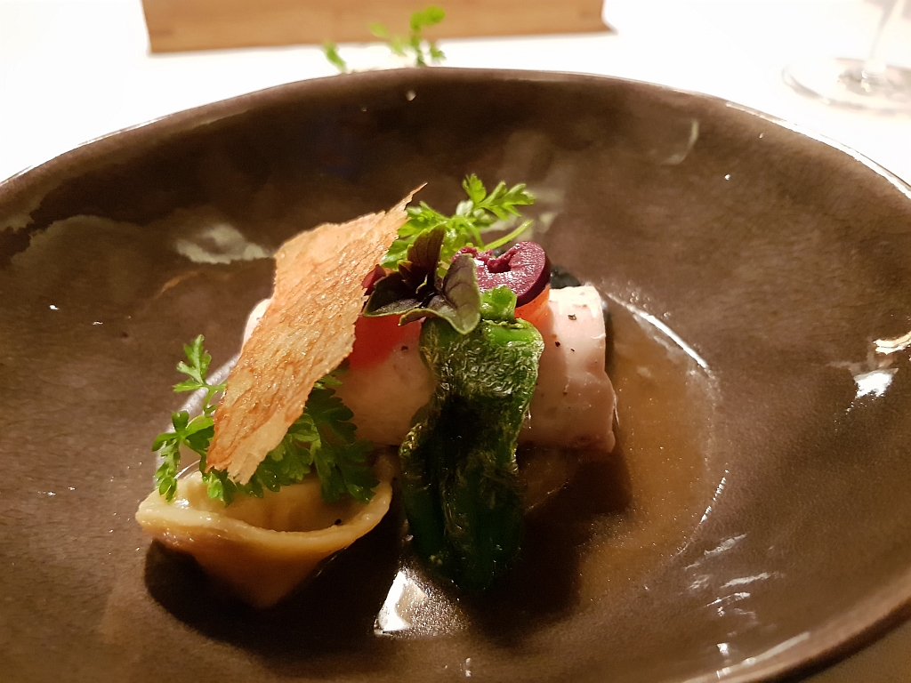 Nächste Runde: ein Bauernhendl mit Aubergine, Olive, Tortelli in einem klaren Paprikafond. Das war natürlich auch gut, aber etwas lascher gewürzt für unseren Geschmack – irgendwie hätte da mehr kommen können, auch wenn die einzelnen Komponenten natürlich gut waren.