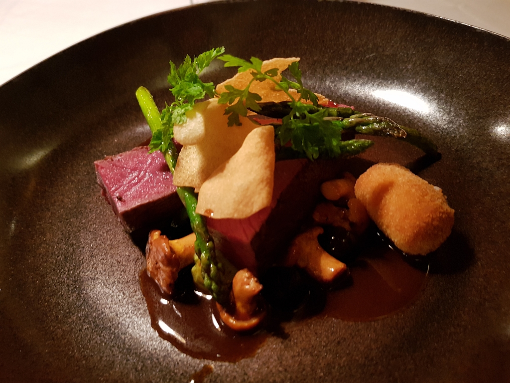 Dann der Hauptgang: Reh & Reherl mit Vogelmiere, Bimi, Heidelbeeren und Croquette.