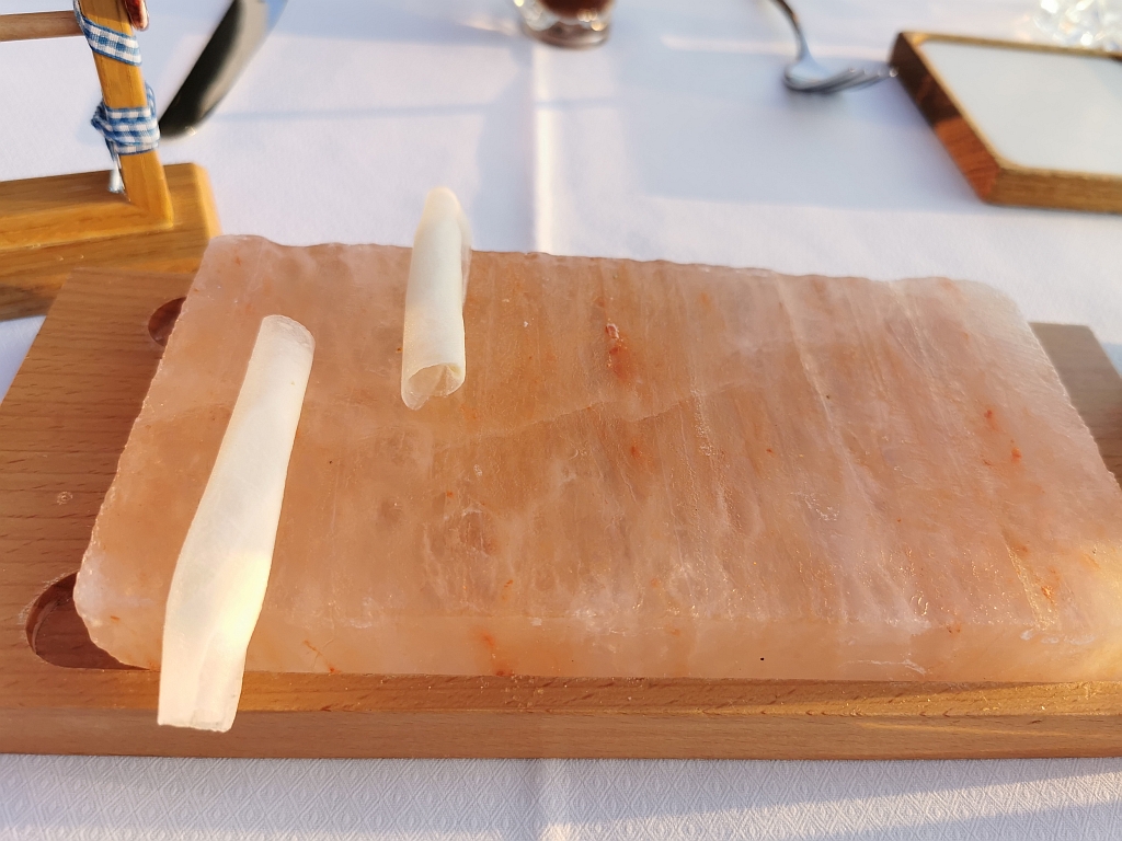 Radi mit Kren auf einem Salzstein. Sehr filigran und super balanciert mit dem Kren und dem Salz.