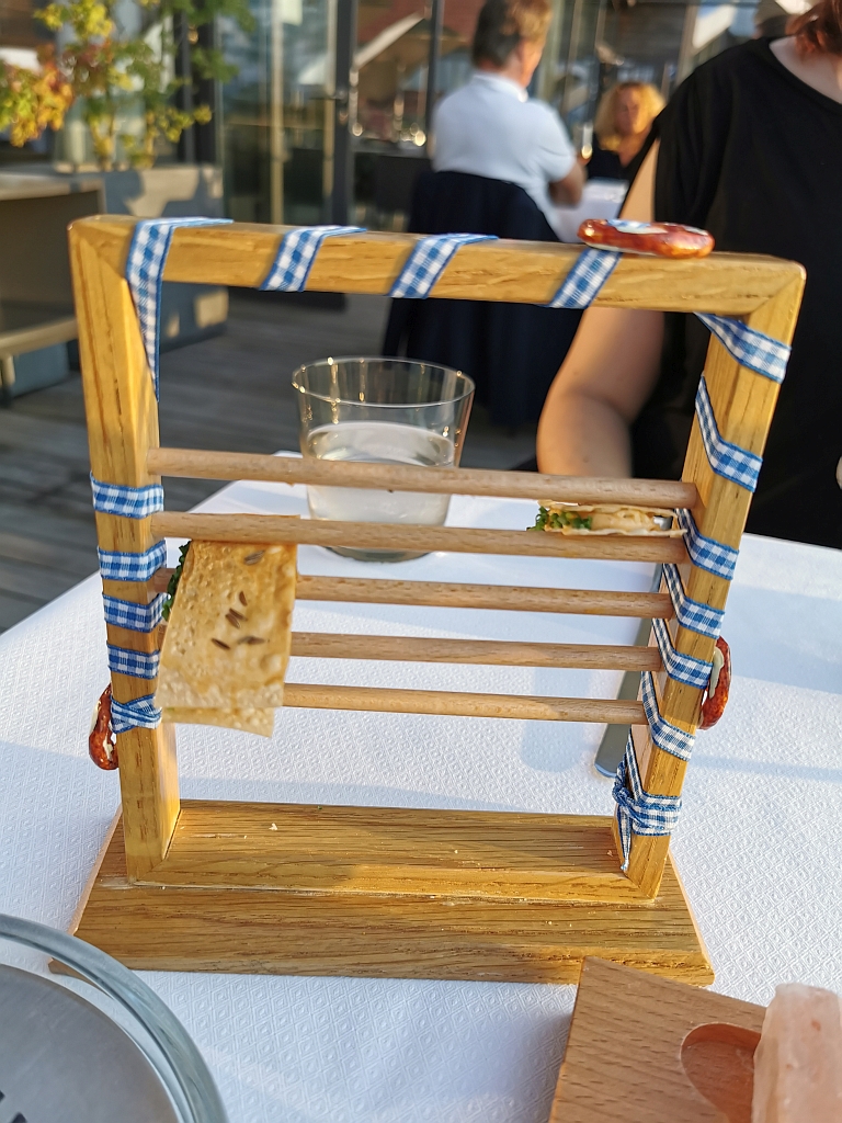 Nachdem wir unsere übliche Wahl „das Menu und Weinbegleitung“, diesmal aber mit einer Änderung bei Meike (Käse durch einen weitere süßen Nachtisch ersetzen), geordert wurde, ging es mit der „bayrischen Brotzeit 2020“ als Gruß aus der Küche los.