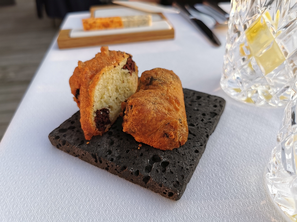Danach kam gutes Brot (4 verschiedene Sorten aus einer Bäckerei im Ort, unter anderem ein Laugenbrot und zwei schöne Körnerbrote) sowie zwei verschiedene Butter-Mischungen. Und dazu noch on-top ein Blutwurst-Brot, was uns super geschmeckt hat. So ein wenig wie ein Krapfen gebacken, nur eben mit einer sehr schmackhaften und herzhaften Füllung. Passte super zu unserem Apertif, von dem wir immer noch Reste hatten: Einer Mischung aus weißem Port und Tonic mit Zitrone.