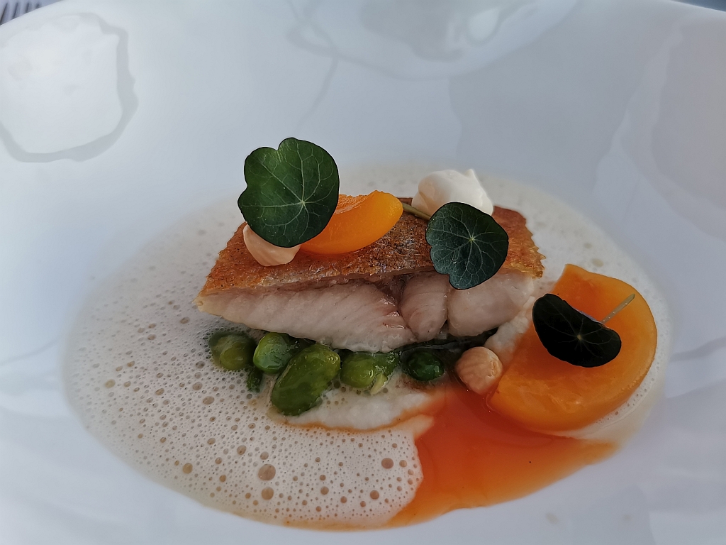 Und genau so ging es weiter, wieder mit dem oft genannten und sehr interessanten lokalen Bezug: Huchen (also Donaulachs) im brauner Butter mit Zwiebelcreme und Marillen-Soße – darunter ein paar Bohnen.