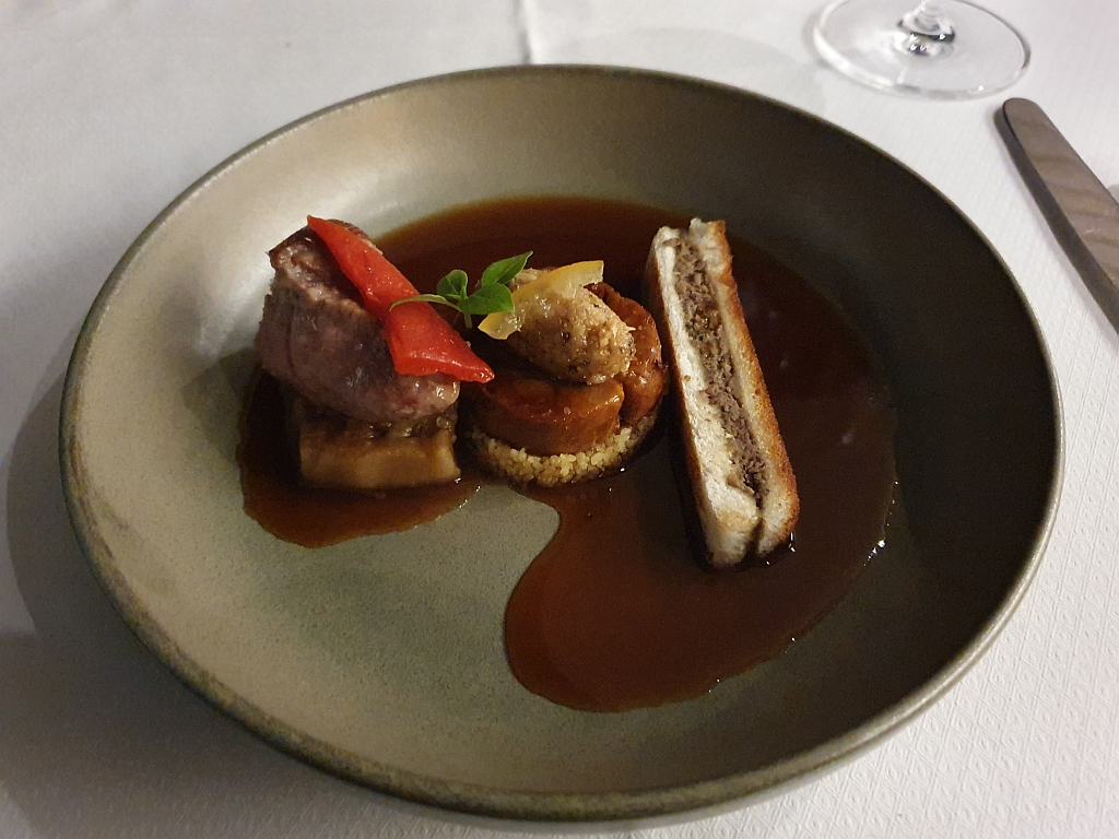 Dann der Hauptgang: Lamm, einmal gebraten und einmal geschmort, mit Paprika, Aubergine und einem Brioche.