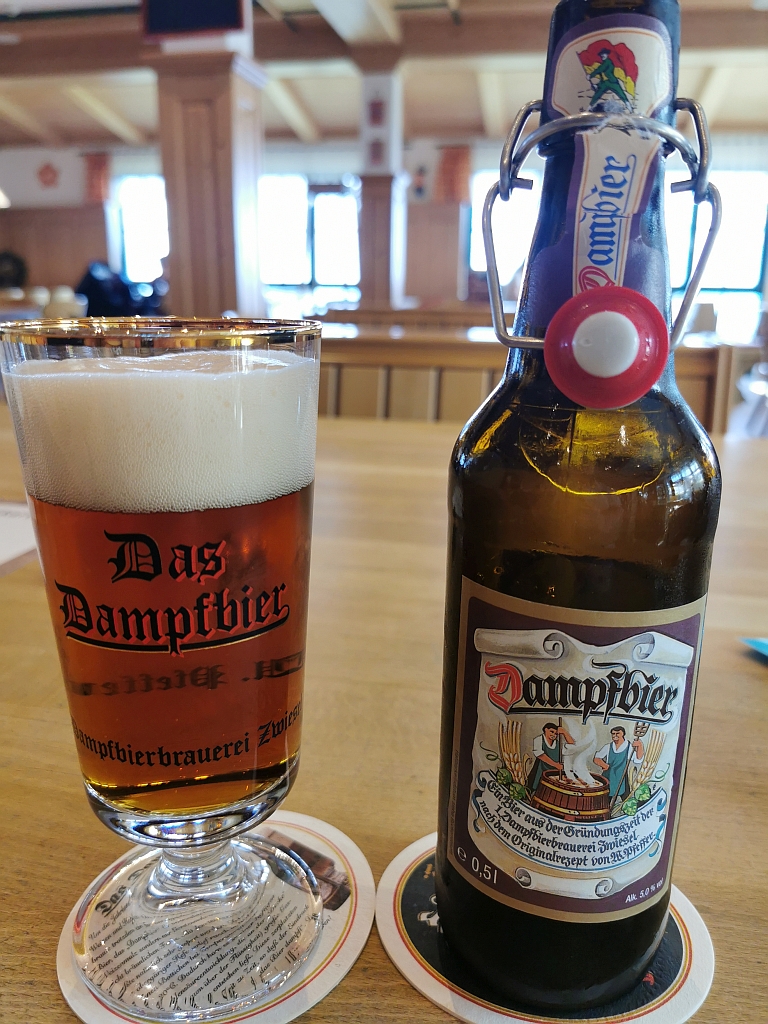 In der Nähe wird nämlich ein sogenanntes Dampfbier hergestellt, eine im 19. Jahrhundert noch recht verbreitete Brauart. Dampfbier wird auch als „Arme-Leute-Bier“ bezeichnet, da vorwiegend billiges Gerstenmalz und sehr wenig Hopfen verwendet wird. Es ist auch ein obergäriges Bier (wie das Kölsch, das Alt oder die Berliner Weiße), was beim Gärvorgang extrem schäumen soll und sich daher etwas Dampf oberhalb bildet. Um zu beweisen, dass es auch früher Marketingspezialisten gegeben haben muss: Der Name „Dampfbier“ wurde auch verwendet, um für die Moderne zu stehen.