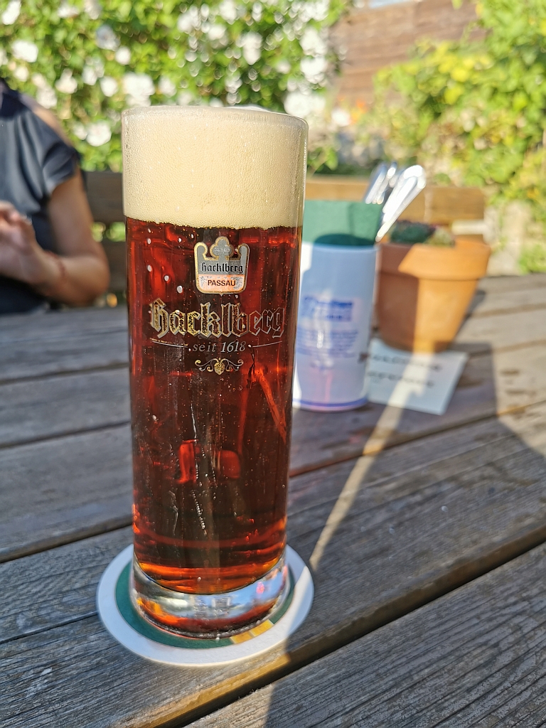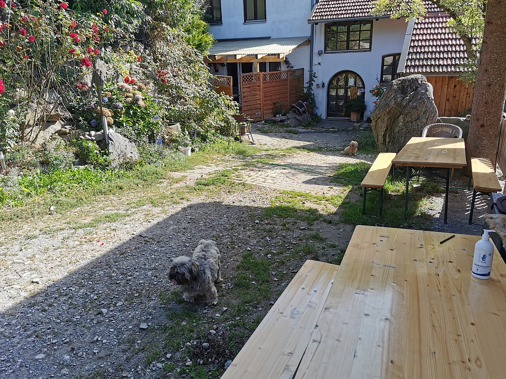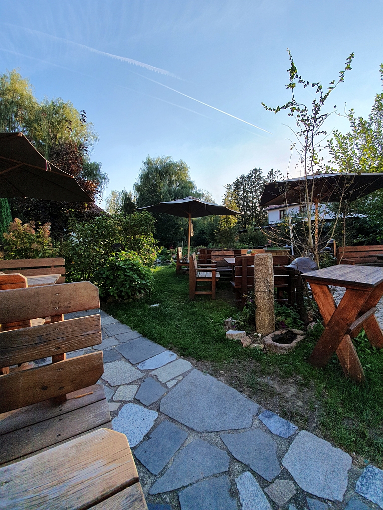 Im Biergarten haben wir uns dann hingesetzt und auf das Heu gewartet. Und uns versorgt …