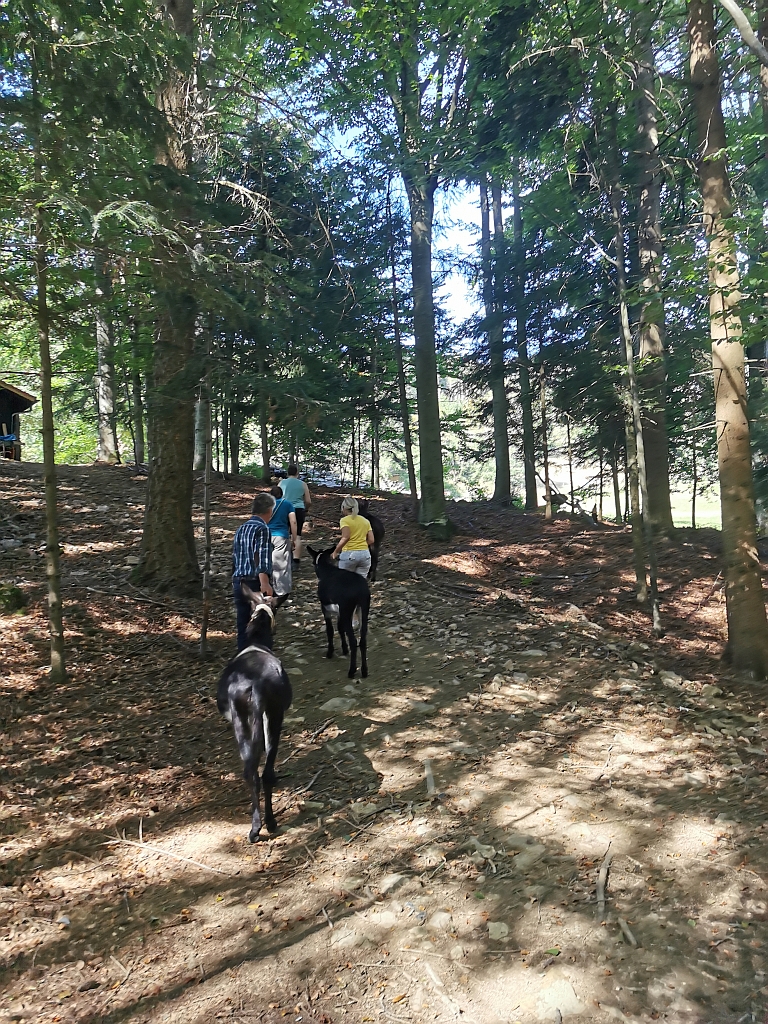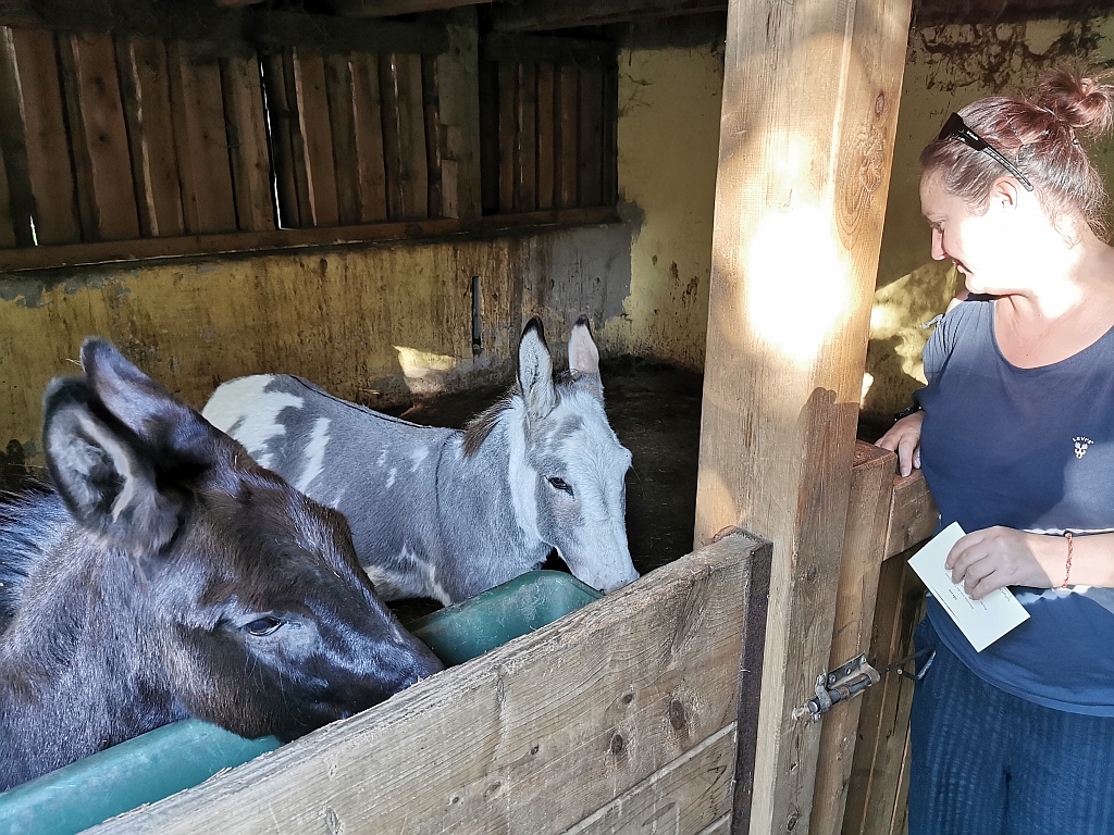 Immer wieder von kleinen Stopps unterbrochen, bekamen wir so einen Crash-Kurs in „Esel“. Und konnten das Gelernte dann auf dem Rückweg zum Hof anwenden.