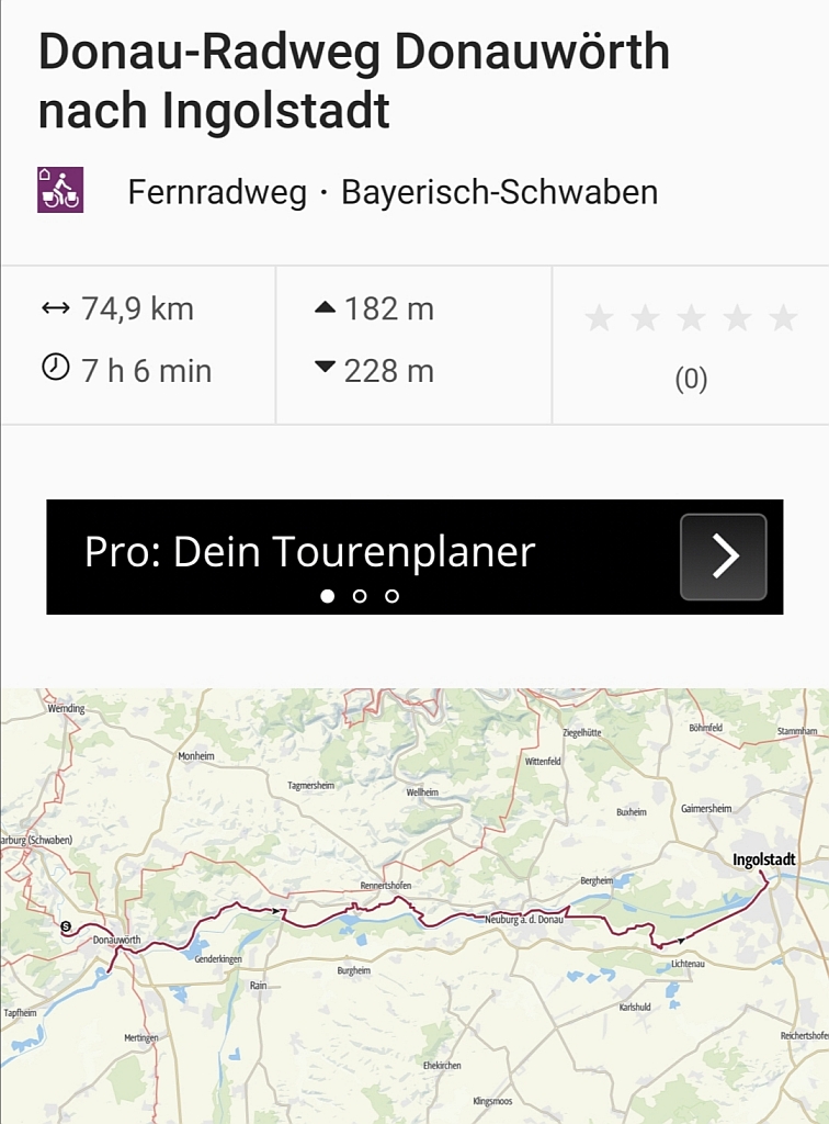 Die erste Etappe geht von Donauwörth-Wörnitzstein über Donauwörth (ab dort folgen wir dem Donau-Radweg) und kleinere Ausläufer der fränkischen Alp nach Ingolstadt. Gemäß der Wegbeschreibung sollen dies knappe 60 Kilometer sein.
