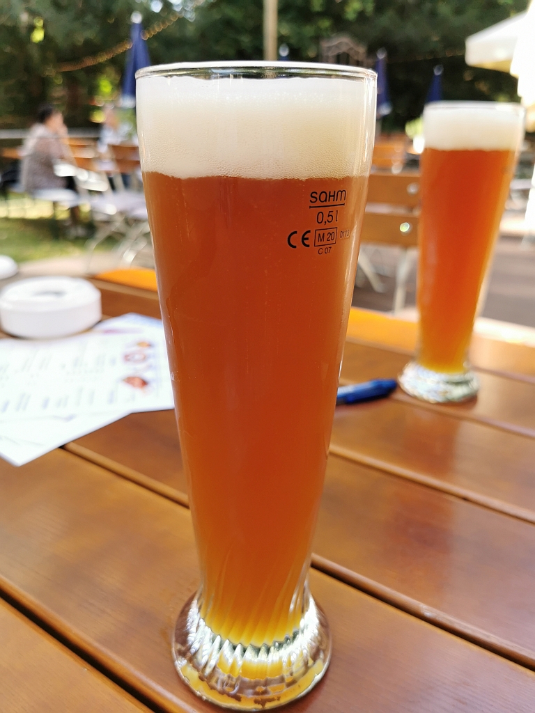 War ganz ok das Weißbier. Was nicht ok war, war die Bedienung (langsam, unaufmerksam) – das gibt Abzug in der Bewertung. Und die Biergarten-Musik war auch zu Ende, was … eigentlich gut war. Aber die Stimmung trotzdem nicht so wirklich hob.
