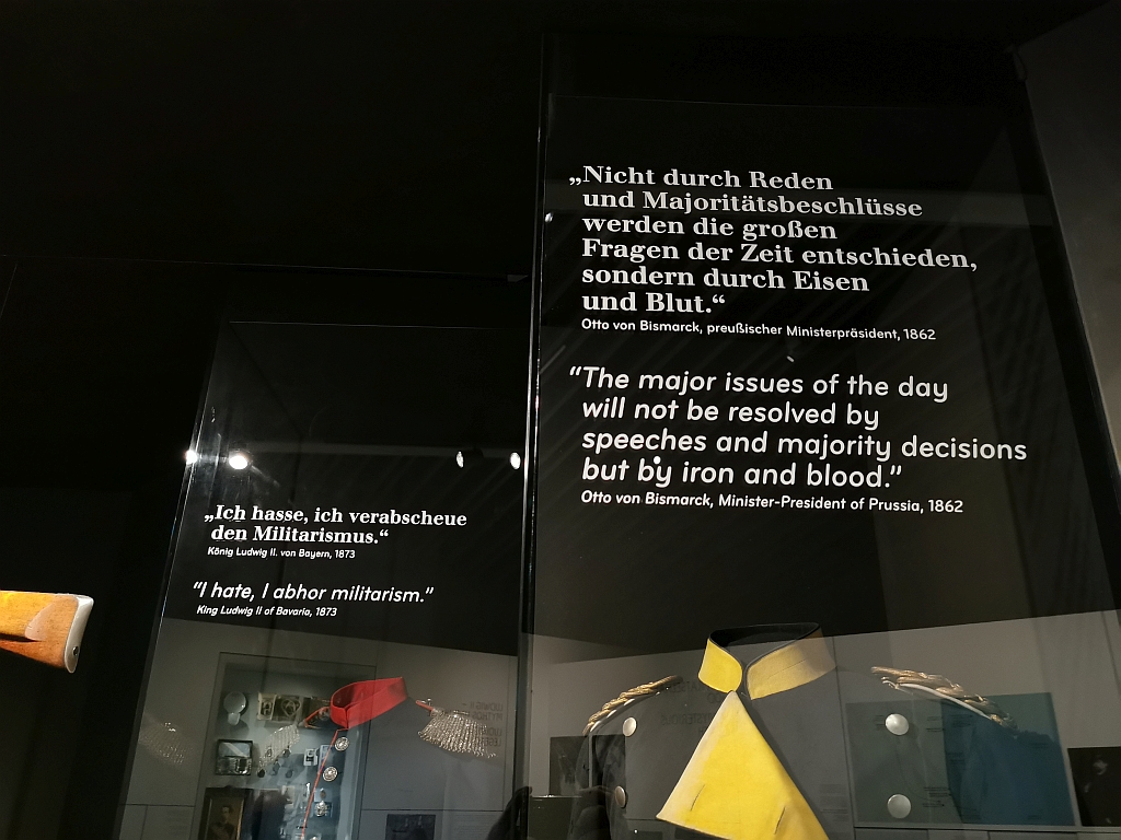 Da eben erst letztes Jahr eröffnet, hat man hier ein sehr modernes, sehr interaktives und gutes Museum, was in vielen kleinen Räumen und Schaukästen, chronologisch die Geschichte des Freistaates seit 1800 bis zur Gegenwart. Immer ergänzt durch Zitate, Ausstellungsstücke und kleine amüsante Anekdoten wie die Gegenüberstellung der Ansichten zum Militär von König Ludwig und Otto von Bismarck.