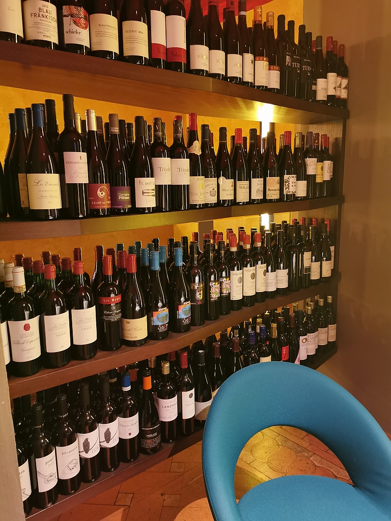 Im schlicht und warm eingerichteten Restaurant wurden wir dann freundlich willkommen geheißen und zu unserem Tisch geführt. Jens wurde dabei direkt vor einem Weinregal platziert, was dazu geführt hat, dass er den ganzen Abend einerseits der Verlockung widerstehen musste (ja, die Flaschen waren alle voll) und andererseits in der Furcht lebte, den Schrank beim Bewegen zum Einsturz zu bringen. Spoiler: Ging noch gerade so gut.