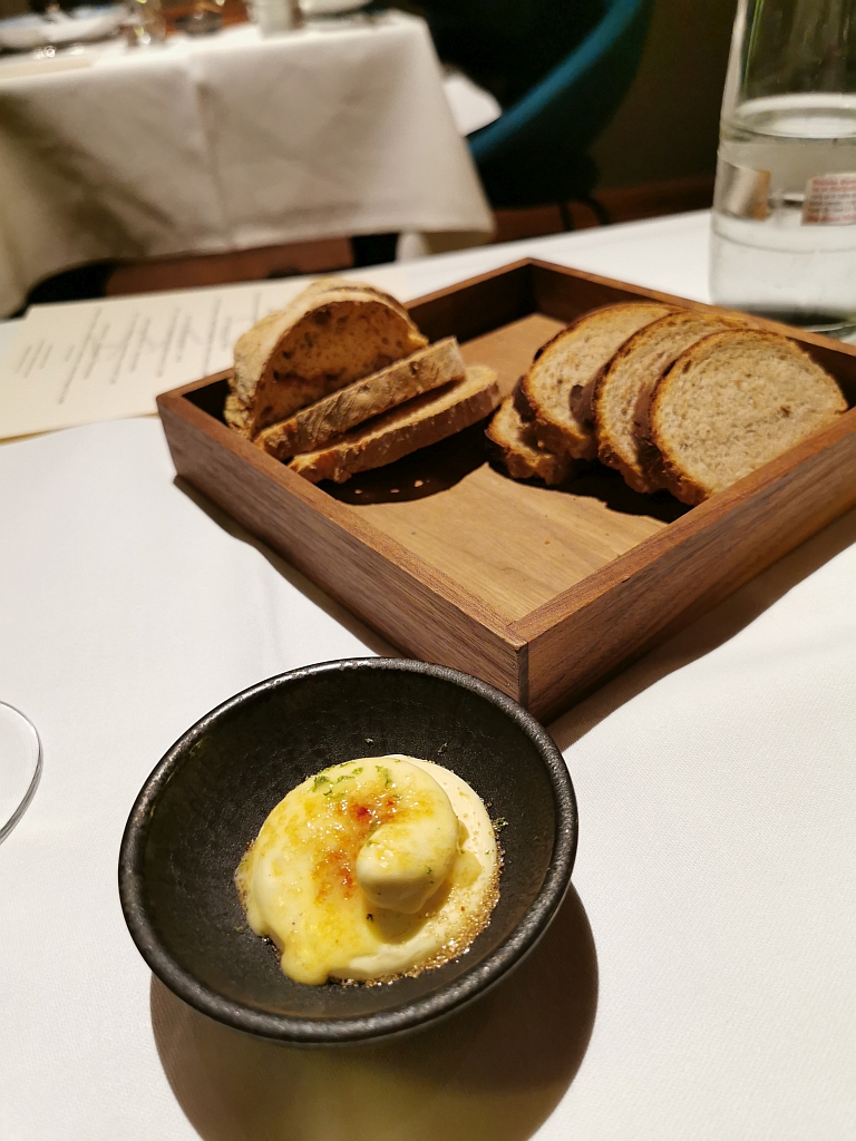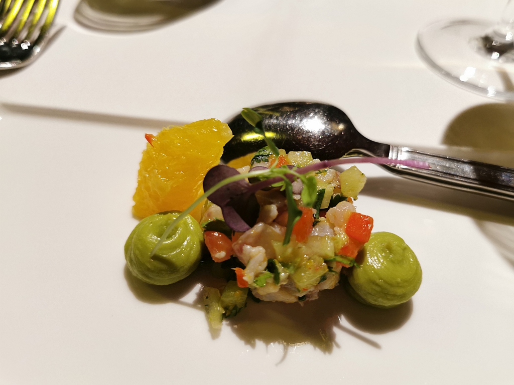 Auch hier war unsere Auswahl einfach: Einmal das Menu (für Meike ohne den Käsegang) mit der Weinbegleitung. Und gleich danach kam ein erfrischender Gruß aus der Küche zusammen mit etwas Brot.