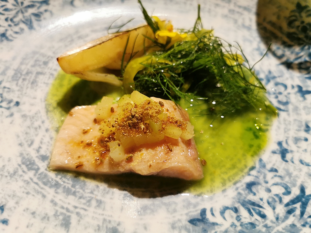 Dann ging es mit Saibling, Fenchel und Apfel, einer sehr klassischen Kombination, los.