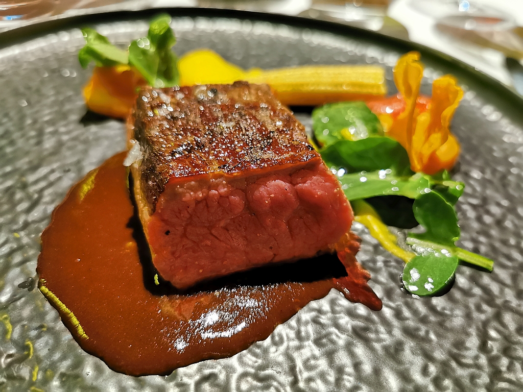 Sehr schönes Fleisch und eine super Soße. Der Rest war eher schmückendes (und wohlschmeckendes) Beiwerk, der Hauptaugenmerk lag aber verständlicherweise auf dem schönen Rindfleisch. Sehr lecker.