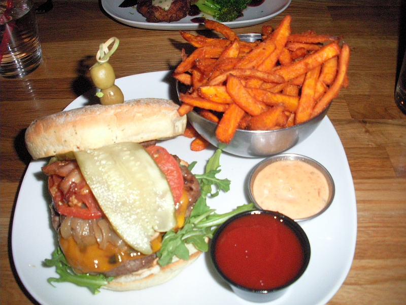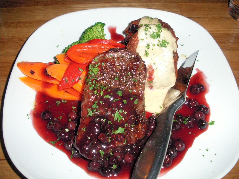 Und als Hauptgericht gab es, wie gesagt, Elch mit Kartoffeln, Gemüse und einer Cranberry-Port-Sauce (für mich) und einen Burger mit Süßkartoffelpommes für Meike.