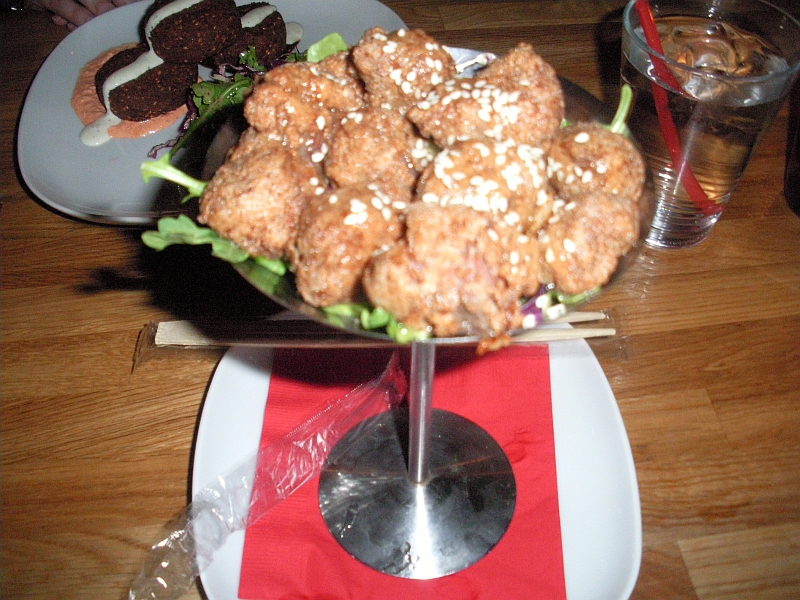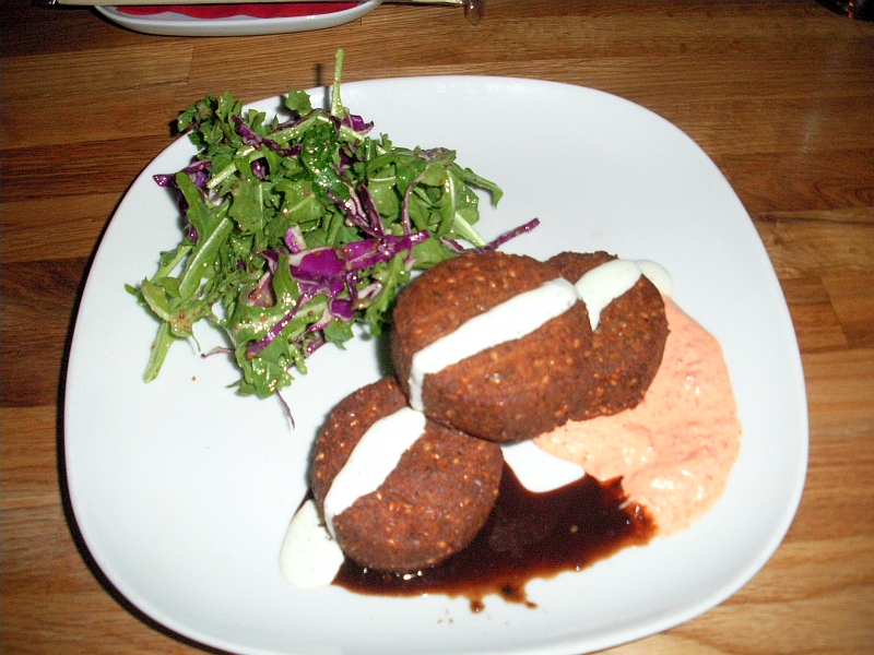 Vorher gab es aber noch zwei aussergewöhnliche Appetizers: Falafel mit drei verschiedenen, hausgemachten Saucen und Miso Steak Bites, was Rindfleischstücke mit Misopanade und einem Salat mit Wasabi Dessing war.