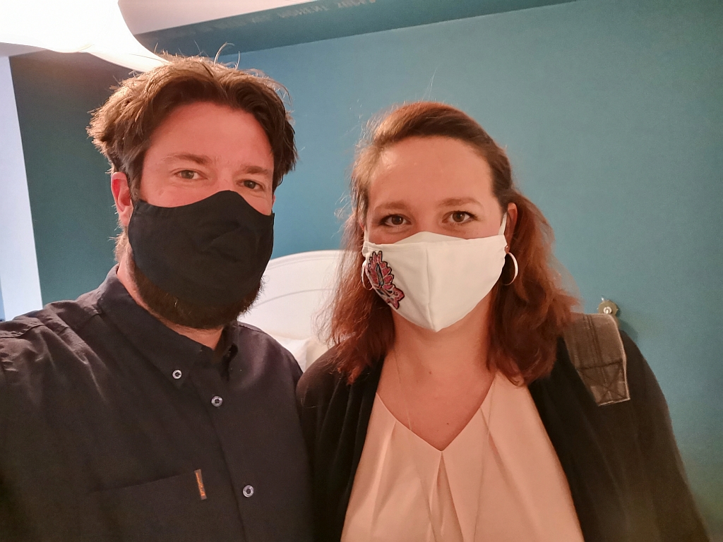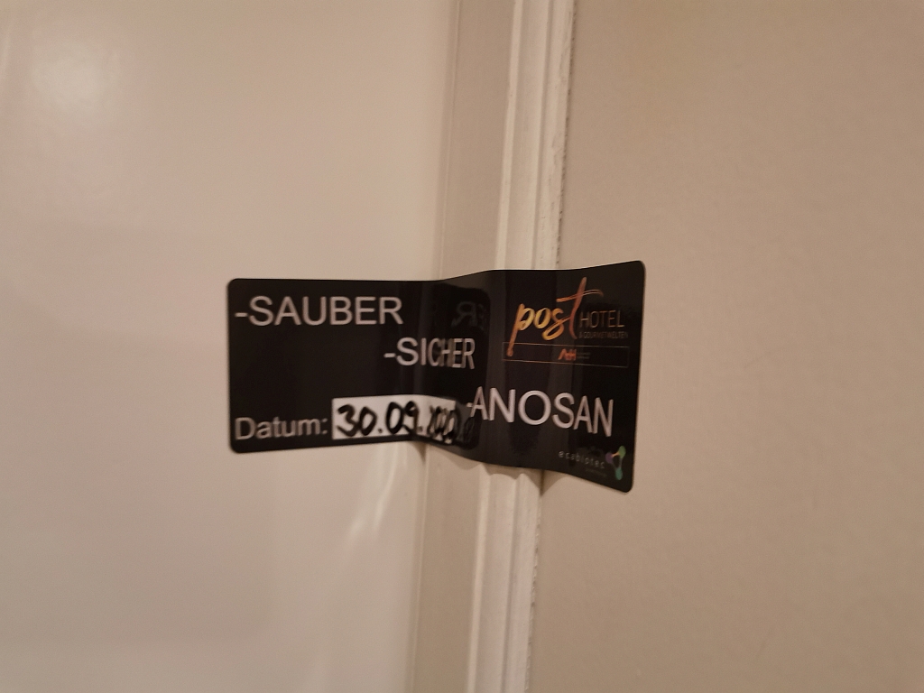 Im Hotel eine interessante Desinfektionsart: Im versiegelten Zimmer wird ein Reinigungsspray hinterlassen und wenn die Gäste dann das Zimmer betreten, ist alles sauber.