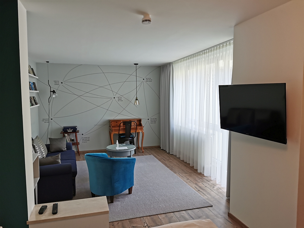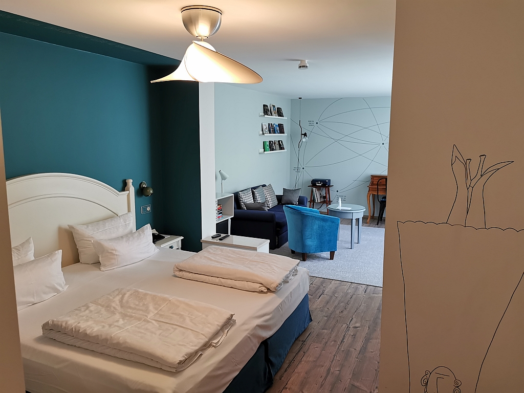 Modern und hurmorvoll eingerichtete Zimmer, besonders das Bücher- und Musikangebot (es gab einen Plattenspieler im Zimmer) war gewöhnungsbedürftig.