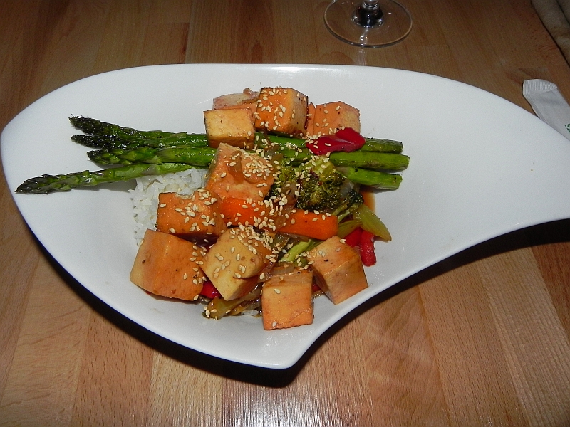 Und als Hauptgericht, „Kung Fu Tofu“ (abgewandelte Form vom MapoDofu mit Bohnenpaste und Reis) und „Typhoon Noodles“ (japanische Udon Nudeln mit Hühnchen und Gemüse).