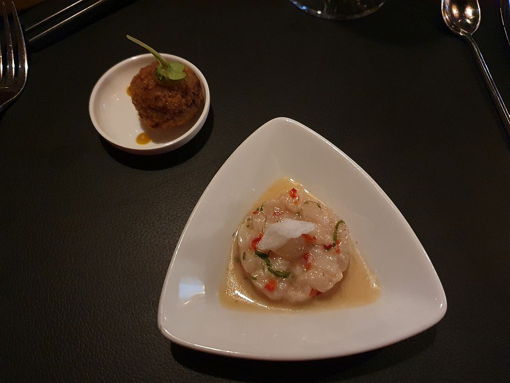 Nachdem wir dann aber unsere Standard-Order abgegeben hatten („Beide das Menu, beide mit Getränkebegleitung“) ging das Feuerwerk mit dem Gruß aus der Küche los: Eine Ceviche und eine gebackene Praline mit Pulled Pork sollten unseren Gaumen anregen.