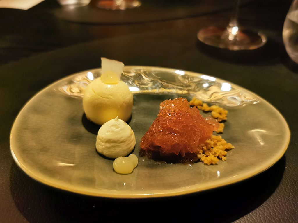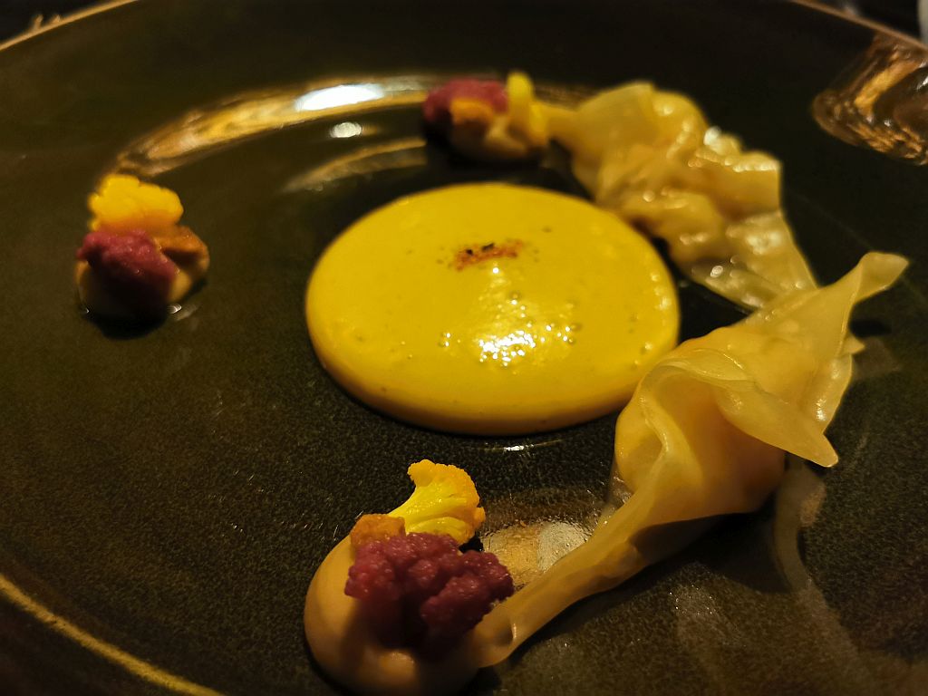 Bei dem Blumenkohl hatten wir die Sorge, dass das schon in Richtung der sauer eingelegten Gemüse aus Japan geht. Ging es nicht, passt sehr gut zu den WanTan und dem Hummer Espuma mit dem Shichimi Togarashi darauf (damit glänzen wir immer, dass wir das so erkennen – eigentlich ist das oft nur geraten). Hierzu gab es dann einen sehr spannenden 2017 Hermes Diactoros II aus Italien (Region Lazio).
