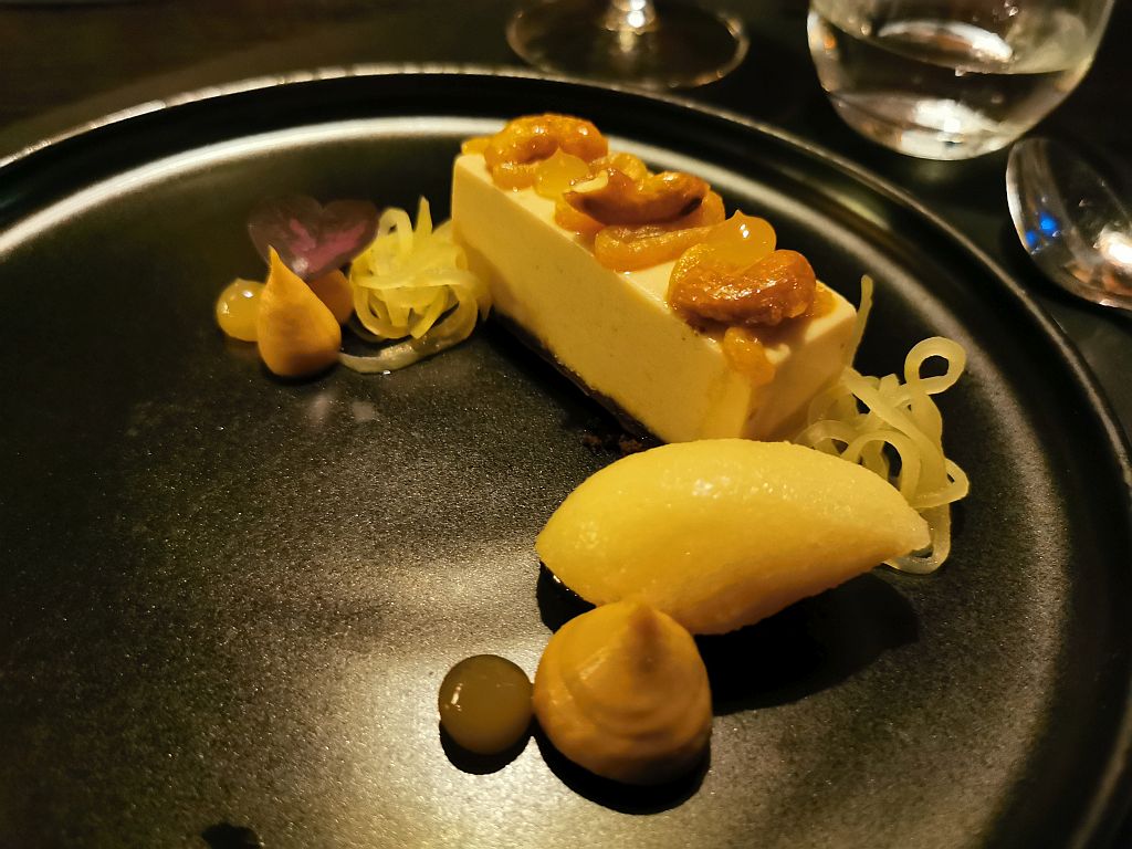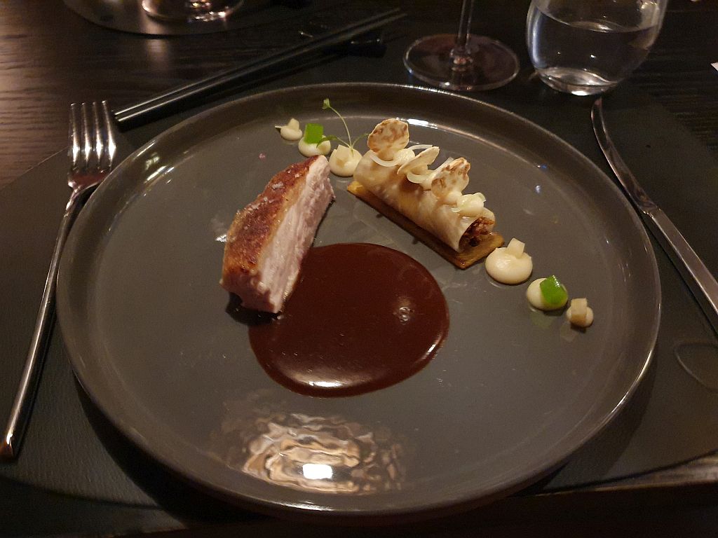 2. Hauptgang: Perlhuhn, Sellerie und Ananas. Handwerklich sehr ansprechend aufbereitet mit (Jens achtet ja sehr darauf) einer recht krossen Haut. Auch hier sehr pan-asiatisch mit Teils koreanischen und Teils indischen Aromen – trotzdem sehr stimmig.