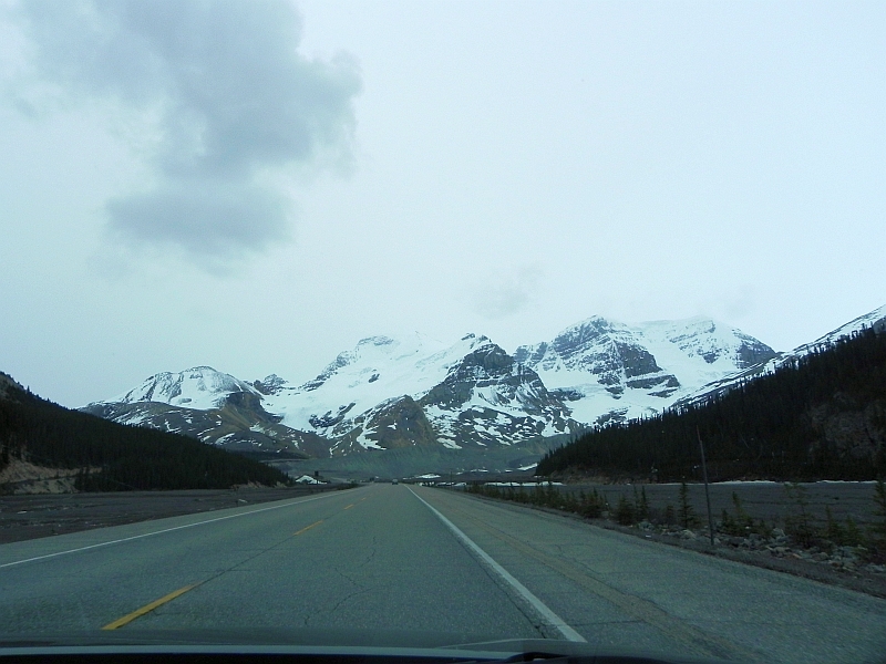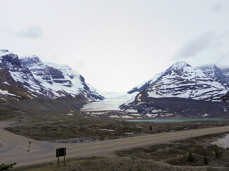 Der nächste größere Stopp war am Columbia Icefield, einem Gletschergebiet, welches aus acht großen Gletschern besteht. Der Athabasca Glacier ist derjenige, den man von der Strasse aus sehen kann und auf den man auch mit speziellen Fahrzeugen gefahren werden kann. Da die Schlange für einen Platz in einem solchen Gefährt aber recht lang war und das Wetter jetzt nicht so doll war (es hatte angefangen zu regnen) haben wir darauf verzichtet. Eventuell komen wir noch einmal hier hin, falls das Wetter wesentlich besser sein sollte – aber im Gegensatz zum Fox Glacier sah das jetzt nicht so spektakulär aus, dass es den Preis rechtfertigen würde.