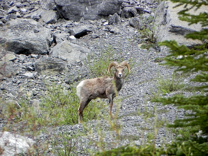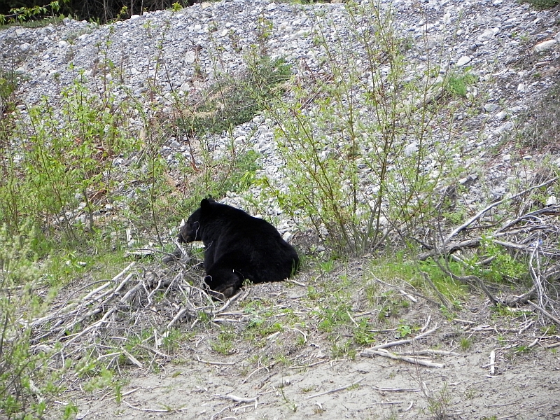 Weiter ging die Fahrt durch eine beeindruckende Landschaft, diesmal gab es wieder ein paar Tiere zu beobachten: Ein Dickhornschaf und einen kleinen Schwarzbären, der sich in einer Wiese gemütlich sein Mittagessen zusammengesammelt hat.