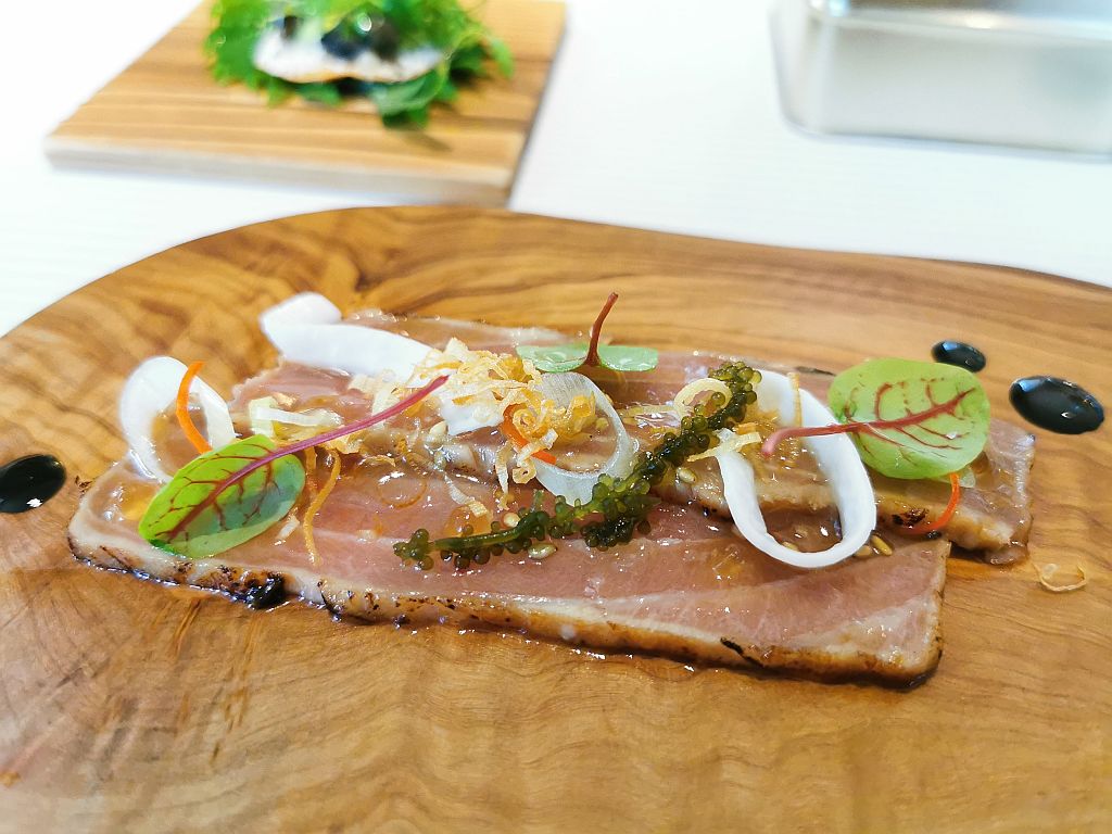 Spanischer Thunfisch mit Gurken-Wasabi Vinaigrette. Dazu eine kleine Alge für den Extra-Meeresgeschmack.