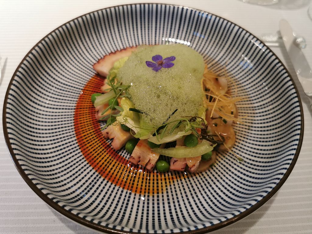 Zweiter Gang: Oktopus-Salat mit Kartoffeln, Pimentcreme, Zuckererbsen und Minze.