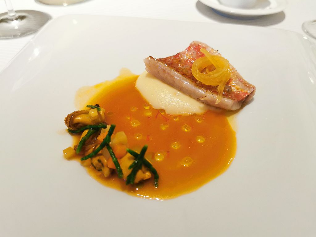 Bei Jens gab es eine Felsen Rotbarbe mit einer Auster in Liebstöckel-Bouillabaisse. Dazu Safran-Kohlrabi-Nudeln, Meeresspargel und eine geräucherte Kartoffelmousse.