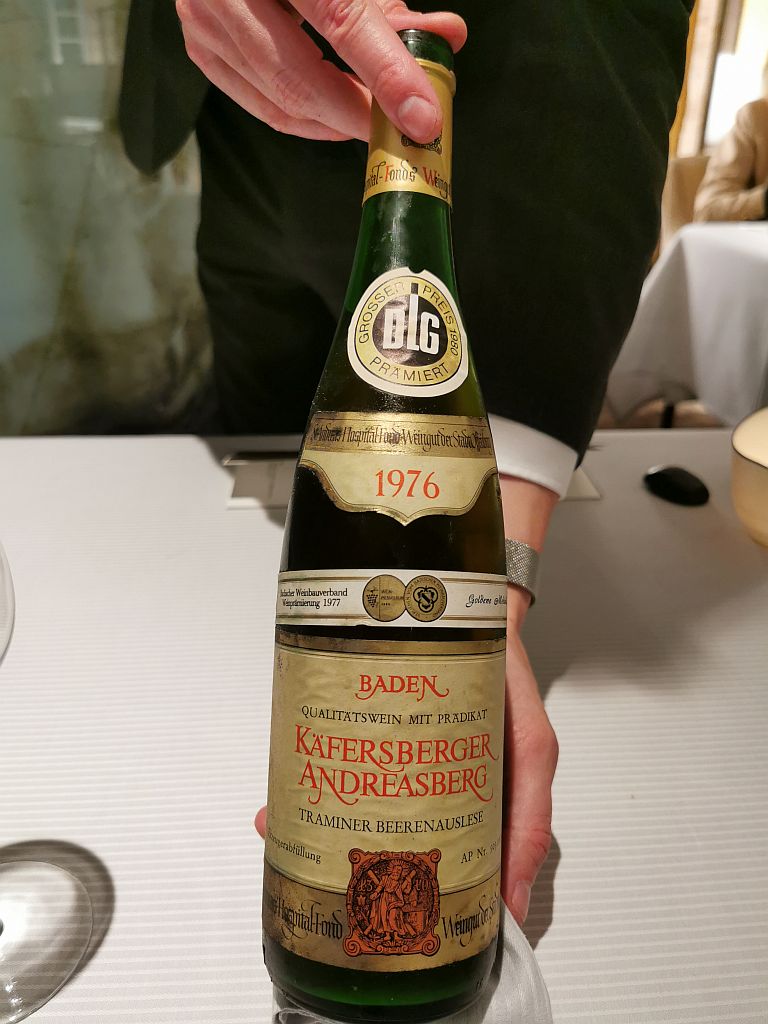 Eine leckere Beerenauslese, älter als wir. Diese Flasche war Teil eines Kellers, die der Betreiber des Grandhotels Bensberg erworben hat. Die Flasche selber war in der Schatzkammer dieses Weinkellers und wurde erste auf mehrfaches Betteln vom lokalen Winzer übergeben. Und kam jetzt in unser Glas.