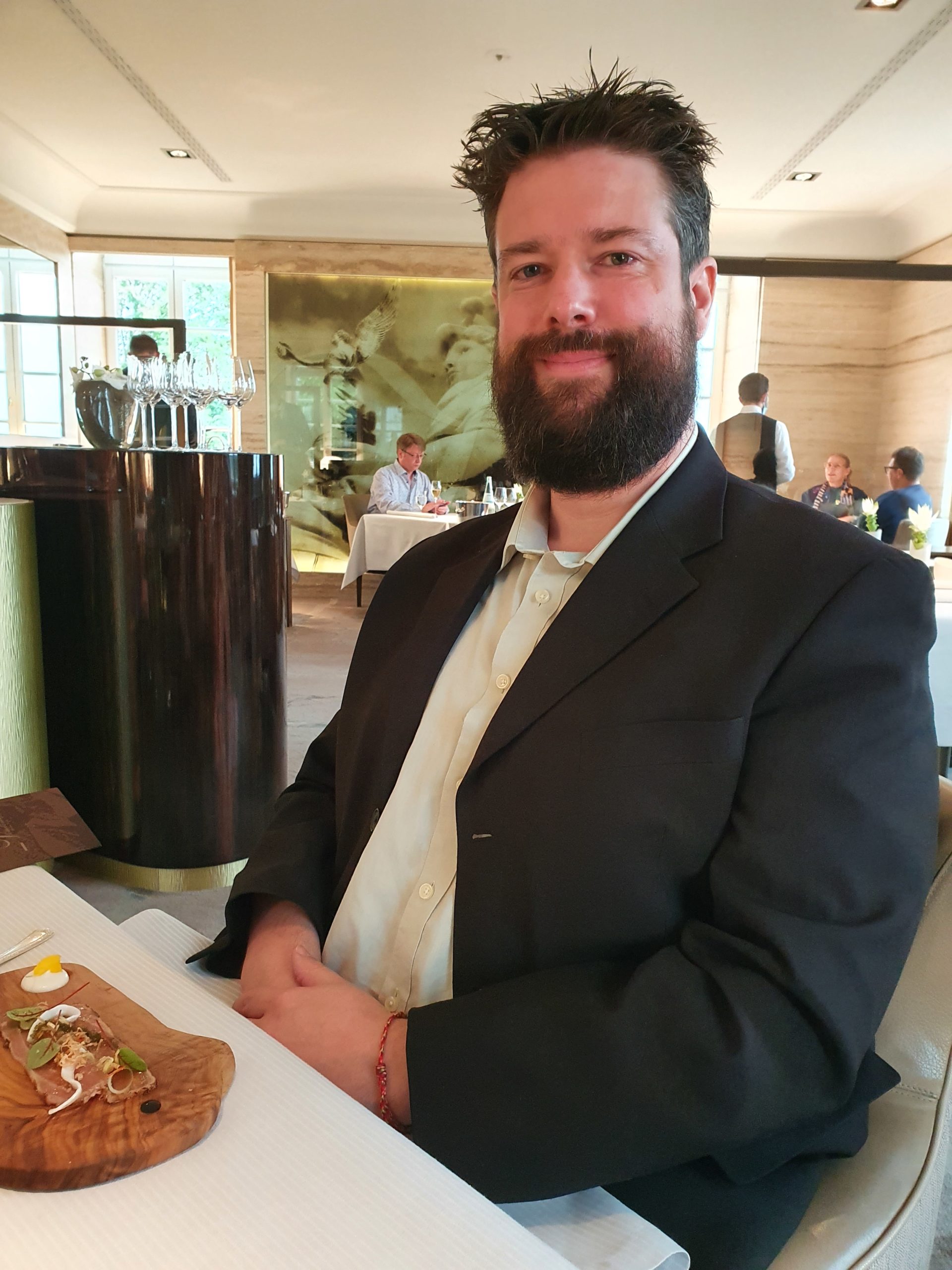 Den Chef de Cuisine, Joachim Wissler, hatten wir letztes Jahr schon kennengelernt. Zu Jens Geburtstag wollten wir nämlich eigentlich schon hier hin, hatten auch schon einen Tisch reserviert. Allerdings kam dann der 2. Lockdown in die Quere und so mussten wir leider stornieren. Als Alternative bot die Küche damals allerdings ein „TakeAway“-Menu an, auf Sterne Niveau. Das haben wir uns dann gegönnt und abgeholt. Zu unserer Überraschung kam Herr Wissler damals aus der Küche, erklärte und haargenau jeden der Gänge und wie er anzurichten ist, schenke uns noch 2 Weingläser und quatschte noch kurz nett mit uns über die aktuelle Situation. Da wir das Geschirr (2 Gänge waren schon auf großen Tellern angerichtet) selber zurückgebracht hatten, haben wir einen Gutschein für 2 Champagner erhalten. Und die haben wir dann natürlich jetzt als Aperitif eingelöst.