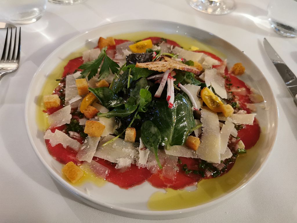 Vorspeise: Capacchio vom Rinderrücken mit Vinaigrette, Parmesan und Radieschen.