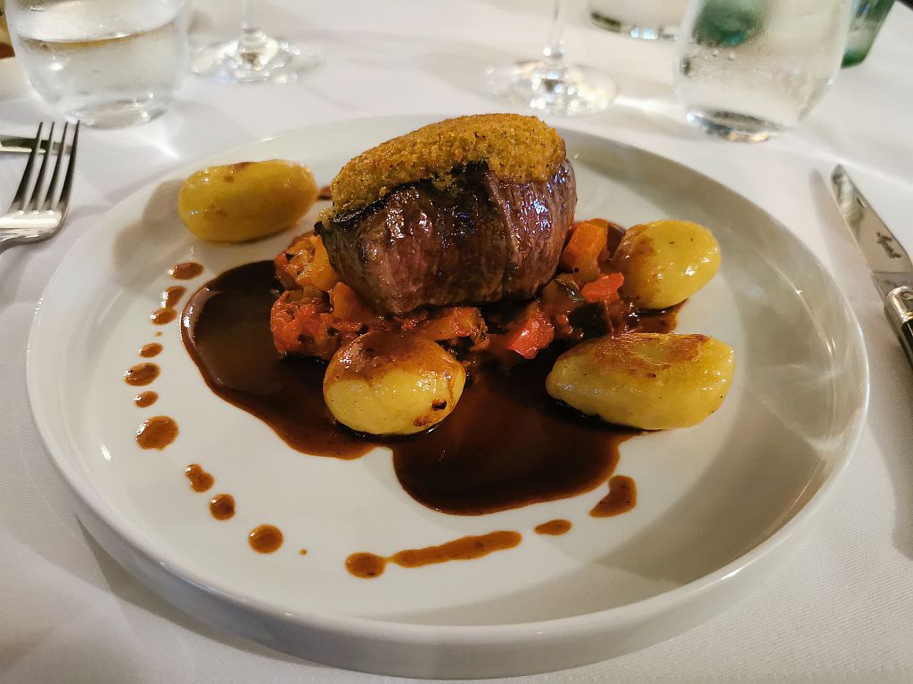 Ganz anders der Hauptgang: Rinderfilet mit Cafe de Paris Kruste, Ratatouille und Gnocci.