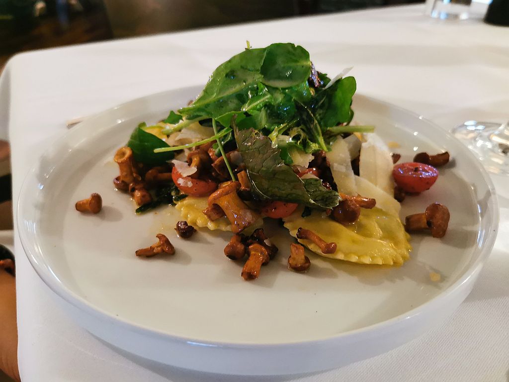 Meike wurde von den Pfifferlingen auf der Tageskarte abgelenkt und bekam so Frischkäseravioli in Salbaibutter und Kirschtomaten.