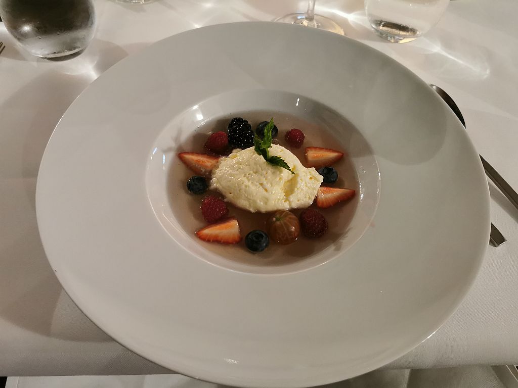 Schon mehr oder weniger satt und zufrieden kam dann noch Nachtisch: Holunderblütenmousse mit Rieslingsud und Beeren.