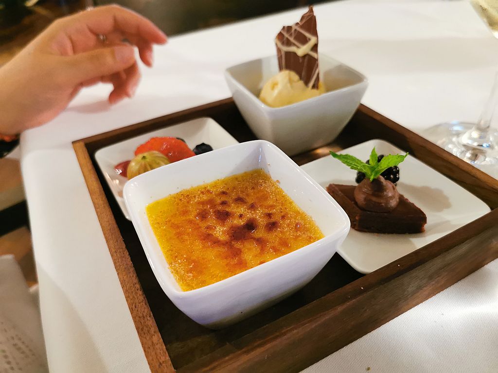 Nicht sauer war Meikes Nachtisch: Creme Brulee und Lavendel Honigeis. Mit Frucht an der Seite und einem kleinen Brownie.