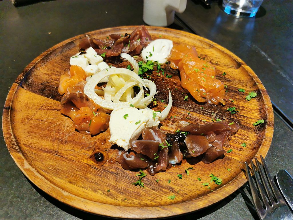 Vorspeise: Lachs und geräucherte Ziege sowie Ziegenkäse und Sellerie.