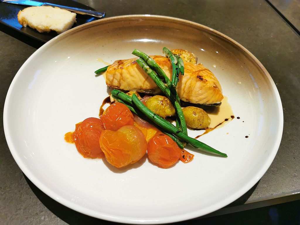Hauptgang: Lachs mit Sauce Béarnaise und lokal angebautem Gemüse.