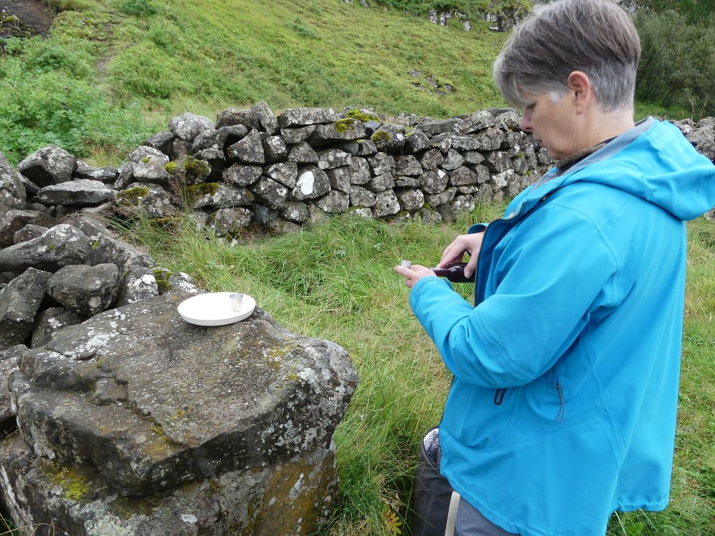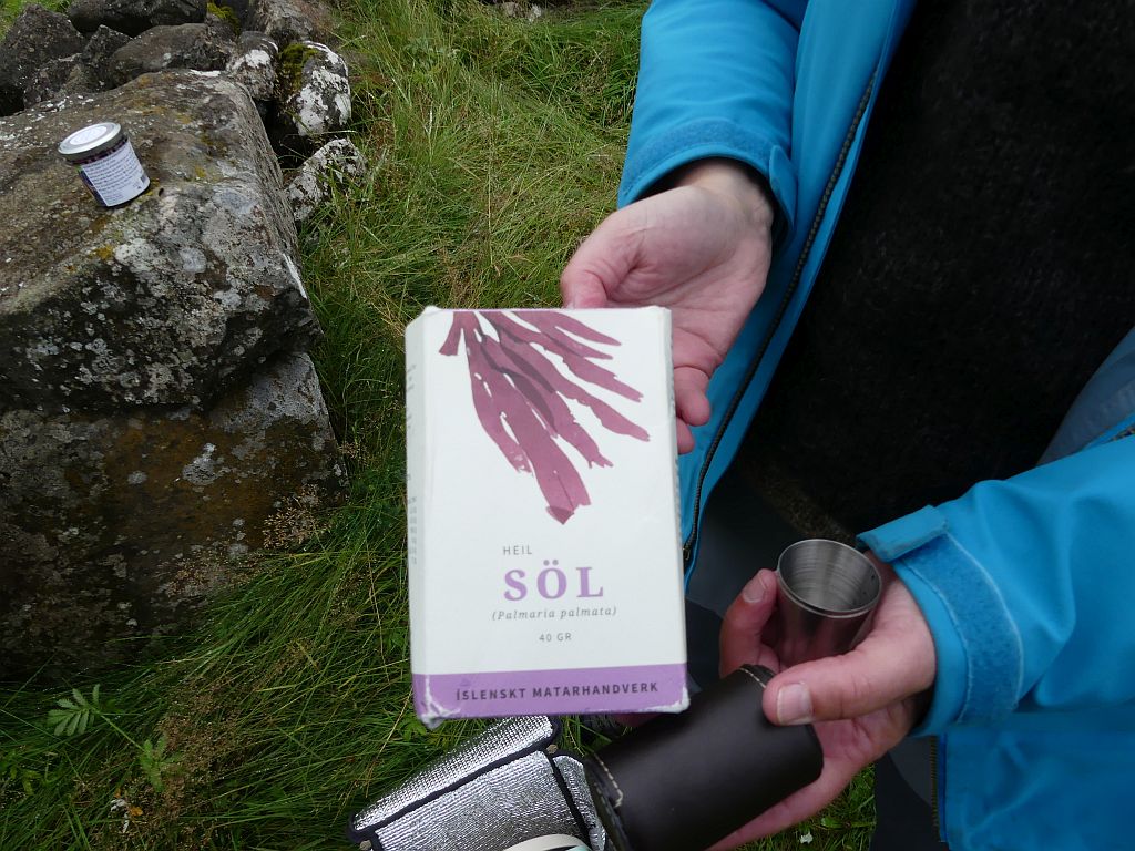 An diesem Wasserfall packte Sigridur eine kleine Mahlzeit aus, alles mit lokalen Lebensmitteln. Von Crackern über Rharbarbargelee bis hin zu dieser leckeren, getrockneten Alge – alles lokal produziert mit dem, was die Insel von sich aus hergibt. Ach so, einen Beeren-Saft mit Kräutern von der Insel, den Sigridur selber entwickelt und vor einiger Zeit an ein größeres Unternehmen verkauft hat.