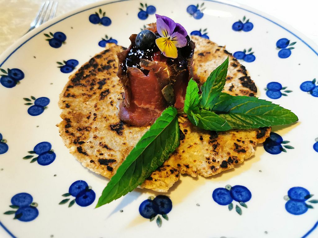 Danach ging es direkt zum Essen. Als Vorspeise eine Art „Fladenbrot“ mit geräuchertem Schaf, Skyr und Blaubeeren-Gelee sowie Minze.